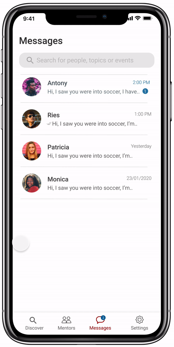 I tested the final mock-ups one more time. This time I did it two ways, I let one person freely explore the app and to the other I gave a specific goal to finding someone with similar interests. This made me understand how users might navigate through the app.